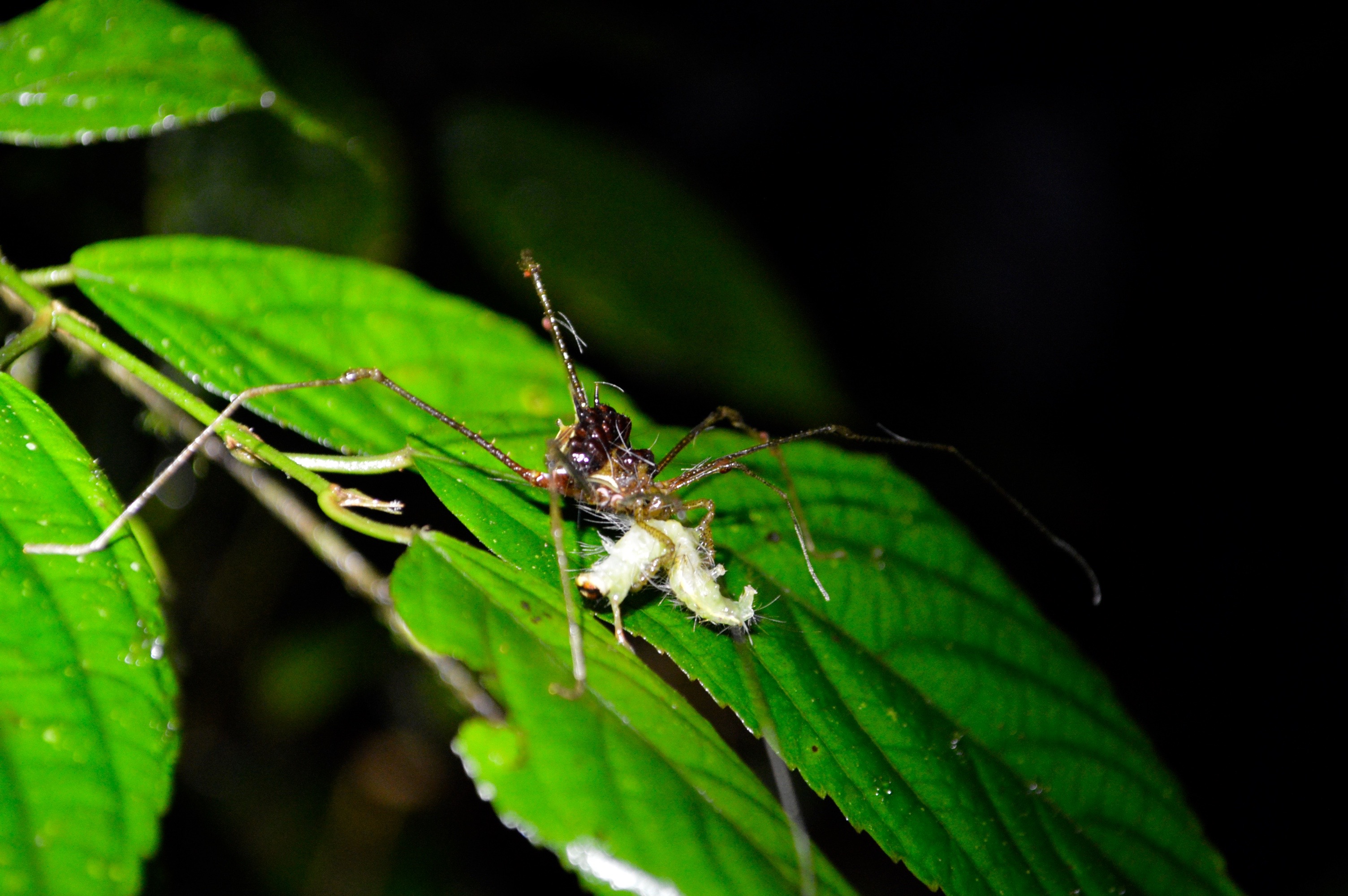 Most people have seen harvestmen and if you’re like me, you even have warm, fuzzy childhood memories of watching them trundle along and even across your open hand, knowing their harmless.  Most people have seen these arachnids quite often in fact, without realizing their not spiders.  You’ve most likely heard of them referred to by their common name, “daddy long-legs” and learned perhaps among other bits of mis-information and urban legends that they’re the most venomous spiders in the world but that their mouths are too small too bite a human.  Not only is this not true but most daddy long-legs aren’t even spiders. I say most because there are some look-alikes that are actually spiders.  Confused?  Let me explain.  Harvest men or Opilionids often have long, spindly legs, which is where the common name, “daddy long-legs” comes from as every child can tell you.  However, this is not the diagnostic feature to separate them spiders (as few people outside of arachnology labs and spider clubs can tell you).  The true way to tell a harvestmen from a long, spindly-legged spider is to look closely at the body segments the spider has two clear body segments but the Opilionid has only one.  Harvestmen also don’t make webs like spiders and roam about the forest usually at night, using their extremely long appendages like antennae to find and quickly subdue any unwary prey.  We’ve seen several Opillionids since arriving at Las Tangaras, always at night, ranging from the tiny and plain to the large and ornate.  A few days ago I was even lucky to get a photo of one eating a caterpillar as I accompanied a Chilean tourist on a night hike.