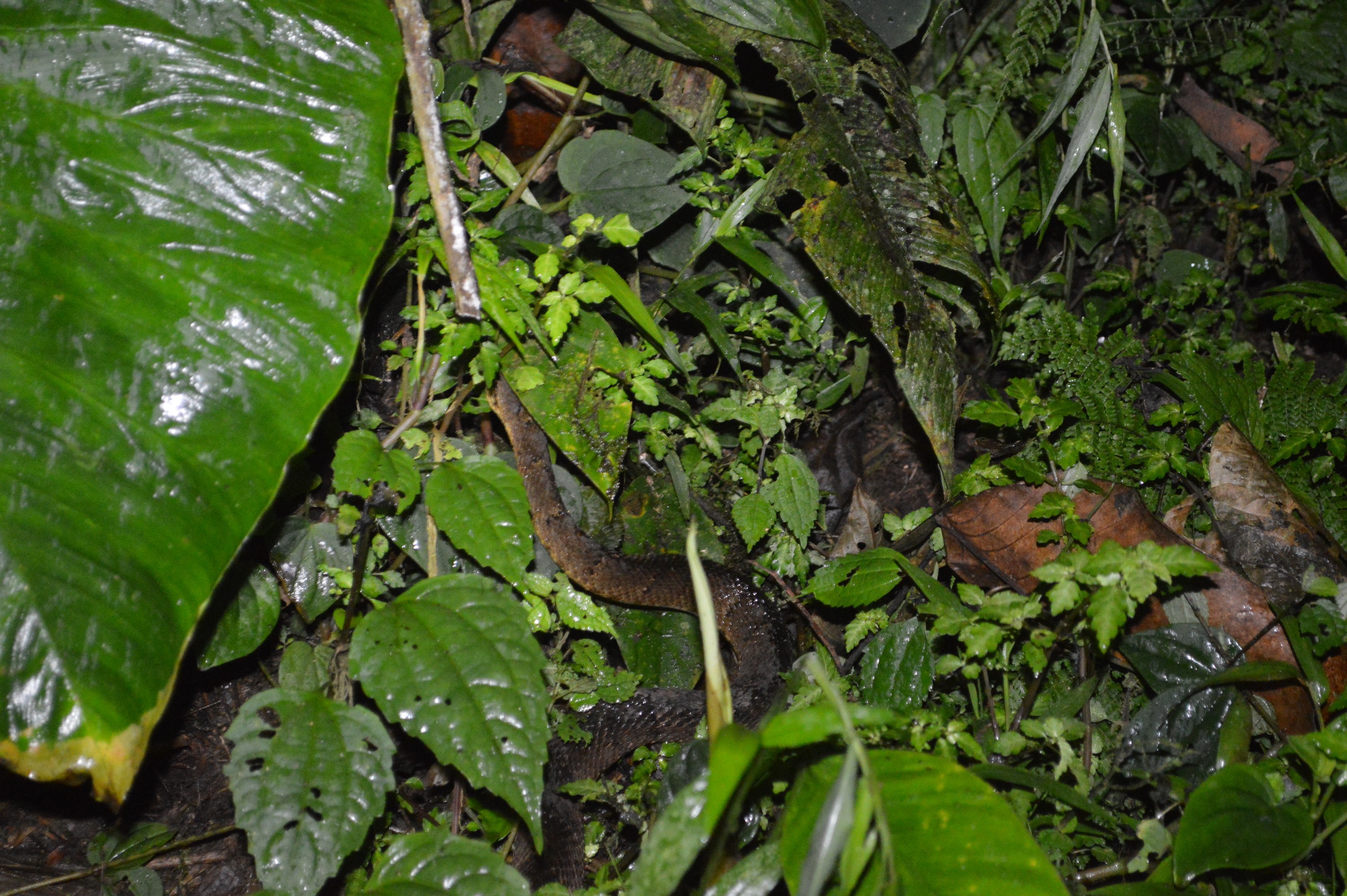We have seen a pit viper once though, (sub family Crotalinae) which was distinct from most of the snakes we see by being extremely thick bodied. The best way to instantly identify a pit viper is by its head though, which is distinct in shape from the heat sensing “pits” behind its nostrils, which allow it to hunt efficiently at night. It was at night that we found the viper too; luckily it was a fairly shy snake, allowing me and the Chilean tourist I was with to snap a few photos before leaving but not letting us get close enough to put ourselves (or the snake) in any danger.