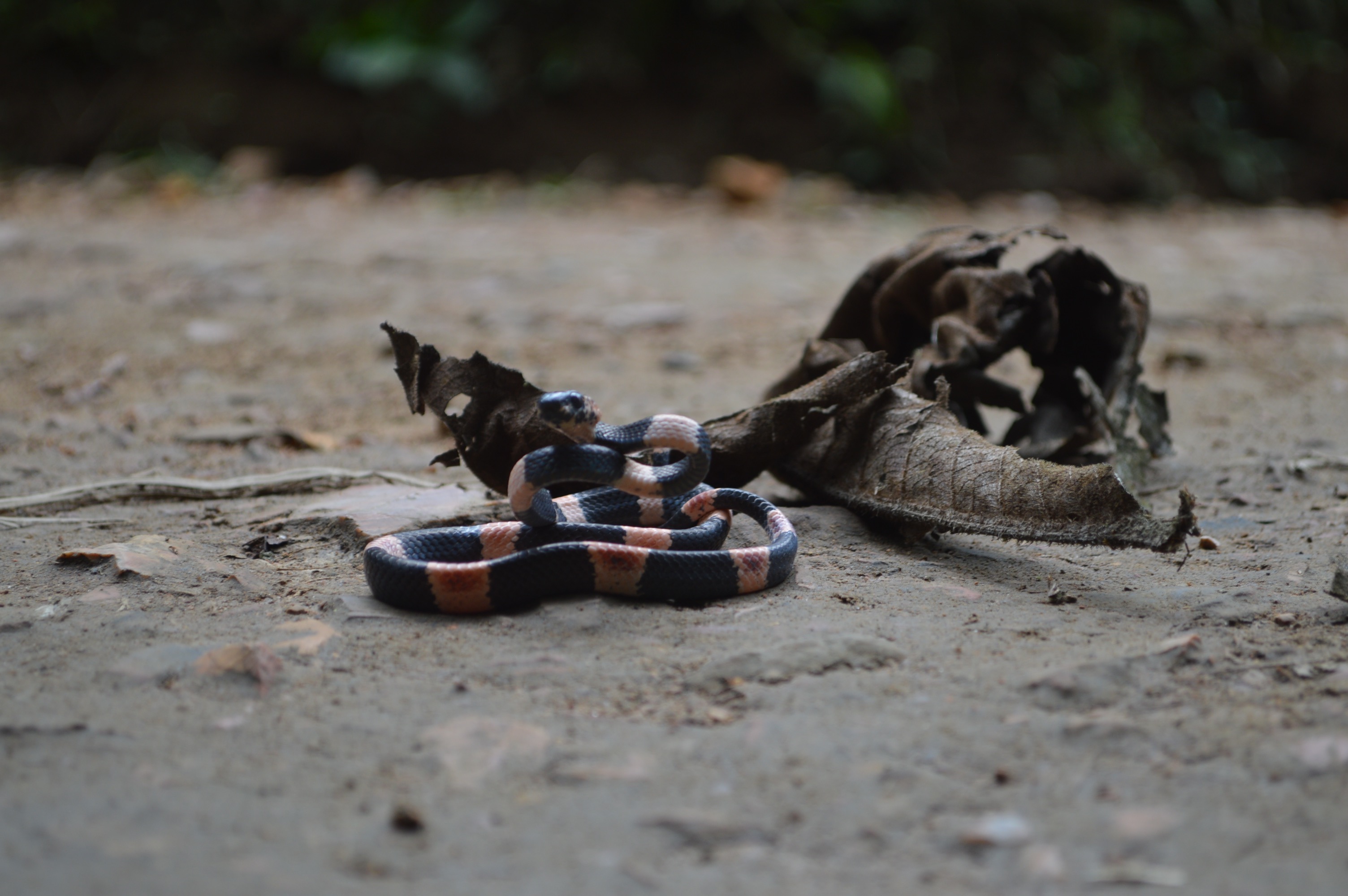 A few days ago while walking the road from Mindo to the reserve I encountered a red and black snake, although it was small I was worried it was a dangerous coral snake. The gnomonic device, “Red on black poison lack, red on yellow can kill a fellow” might work in North America but in South America it’s useless and can get you into a very sticky situation. Still, the little snake was only sunning itself on a road, waiting to be smashed flat by a passing car and I’m not really a believer in nuisance animals or eradication of any native animal. So using a very long stick, I carefully scooped the snake up and moved it to the side of the road where it soon slithered away, probably grumpy at having a relaxing nap interrupted. When I got back to the reserve, I compared my photos with the book and discovered, the snake wasn’t a coral snake, or even dangerous. The snake I’d helped cross the road was actually a Graceful Snail-Eater (Dipsas gracilis). Undoubtedly, the Graceful Snail-Eater has evolved to use the dangerous look of a coral snake to its advantage. A mimic of a toxic or poisonous animal is less likely to be preyed upon by other animals (it is common for butterflies to look like more poisonous relatives and get eaten less often by birds), unfortunately for the Snail-Eater looking more dangerous makes it so one animal is more likely to kill it. Humans often kill the Graceful Snail-Eater when they mistake it for a Coral Snake, so goes evolution, a useful adaptation can become a detriment as the environment and the faunal assemblage changes.
