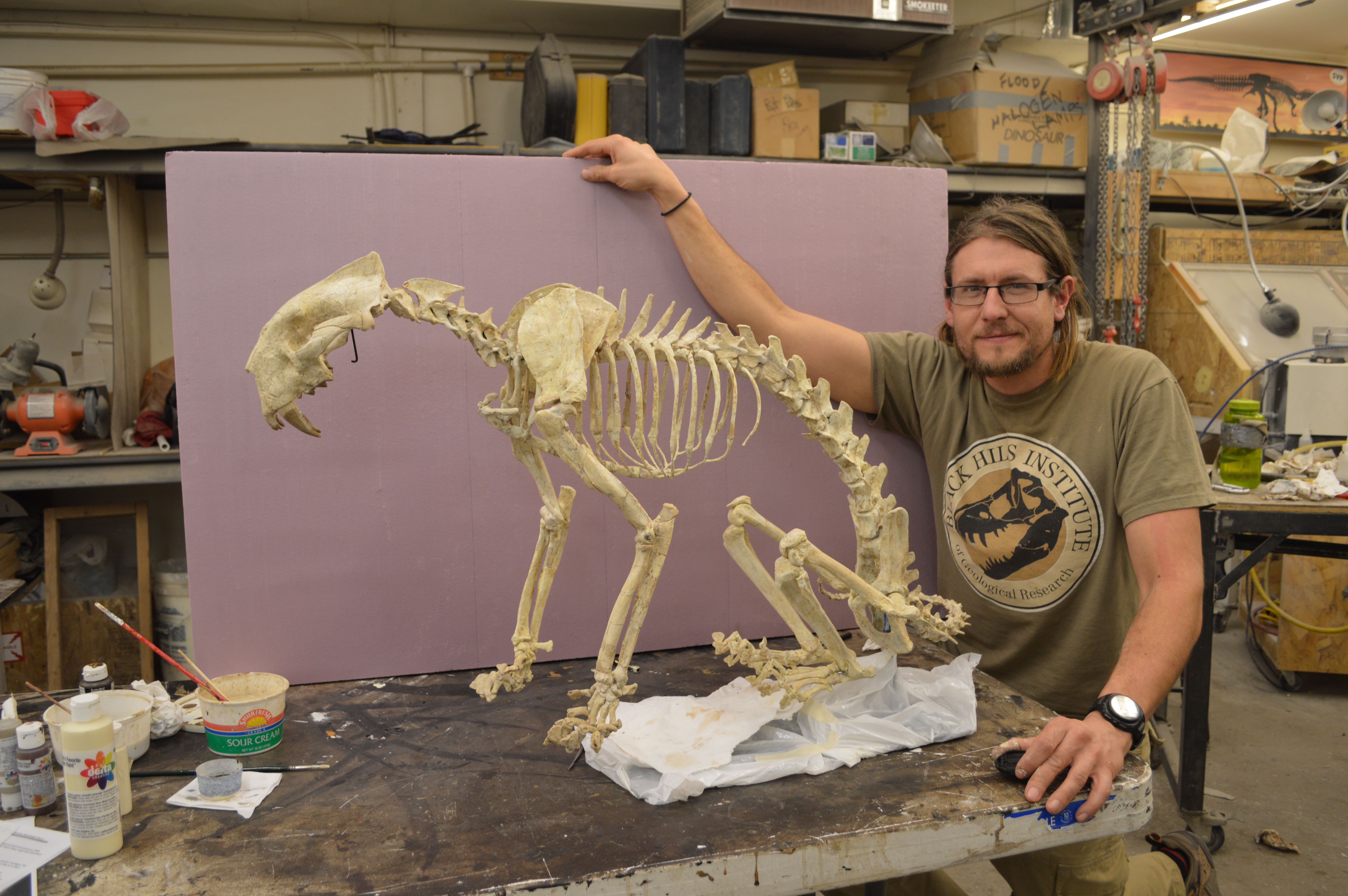 Recently my job (Black Hills Institute of Geological Research) has been gearing up for the Tucson fossil show, a big annual event in commercial paleontology.  We’ve been working on building some impressive displays including ammonites but focusing more on different genera of nimravids.  Nimravidae is a family of mammals that closely mimic saber toothed cats; a classic case of convergent evolution.  Smilodon is the classic example of a saber toothed cat and actually a felid (cat) unlike the nimravids we’ve been working on.  Still, there are some impressive similarities such as retractable claws between the two groups of mammals; evolution is endlessly creative.