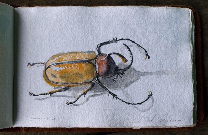 I met Loren a few years back in an entomology class and right away I knew he was an interesting guy. I remember despite being in a science class he had aspirations of being a professional natural history artist and looking at his work, one cannot help be impressed. Since that class he’s finished a degree in biology and travelled a bit. Loren spent a year at Yanayacu Biological Station & Center for Creative Studies in Ecuador’s cloud forest. While in Ecuador Loren also climbed some impressive mountains including Chimborazo, Cotopaxi and Sumaco. He’s also done a description illustration for a new species of plant and done work surveying rare plants and raptors. Right now Loren is somewhere at sea in Alaska working as a fisheries observer. Loren is a great mix of outdoor adventurer, scientist and artist. I’m posting a painting he did of a Golofa Beetle, a genus of rhinoceros beetle. Enjoy! To see more of Loren’s work visit his portfolio website or facebook page.
