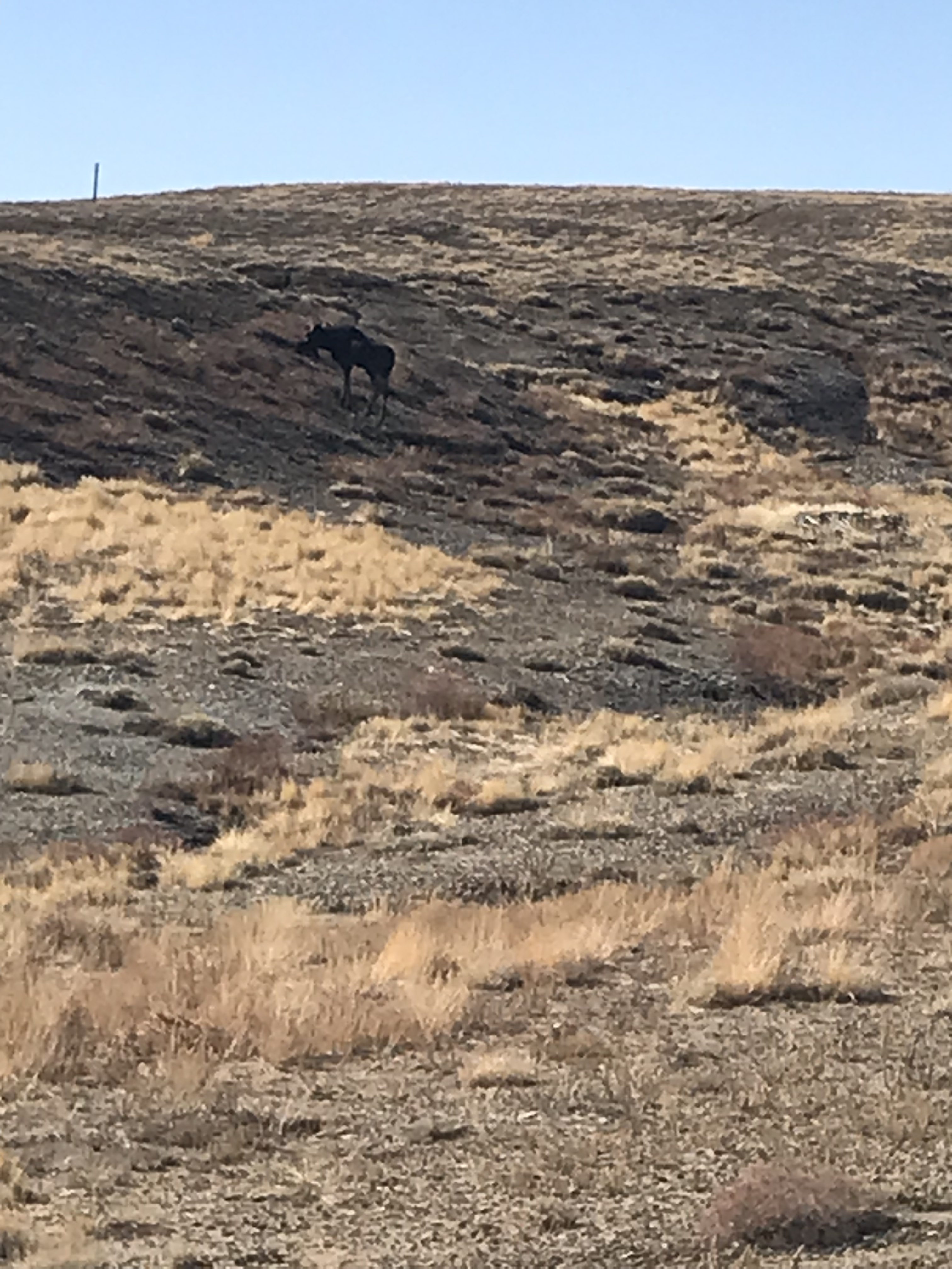 The bad photo of the moose I have here however, is a different story. This moose was photographed in the White Water Desert of Western Colorado. I can only imagine this moose wandered down from the Grand Mesa, the nearest moose habitat I know of, a place where moose were introduced by Colorado Parks & Wildlife in 2005. I say introduced because although it’s possible moose lived there historically, there’s no evidence. It seems to be good moose habitat though and they’re flourishing, even wandering into the desert it seems.